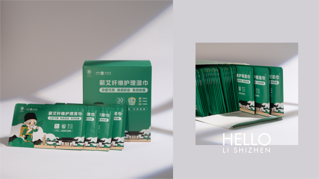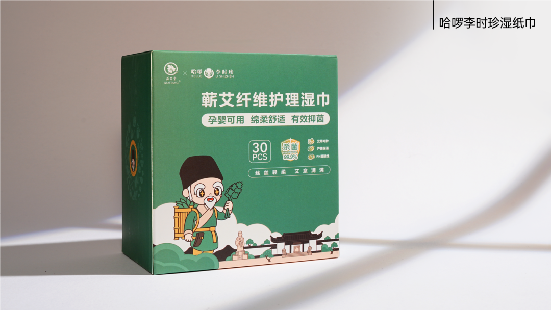 "哈啰李时珍健康湿纸巾" 在设计上独具匠心,以统一的视觉语言巧妙呈现品牌核心IP形象,确保了风格的一致性和高辨识度。通过规范化的视觉传达,既延续了品牌的专业水准,又生动展现了传统医药文化与现代创新精神的碰撞与交融。小小的面巾纸,不仅是日常生活的必需品,更成为了文化的载体。