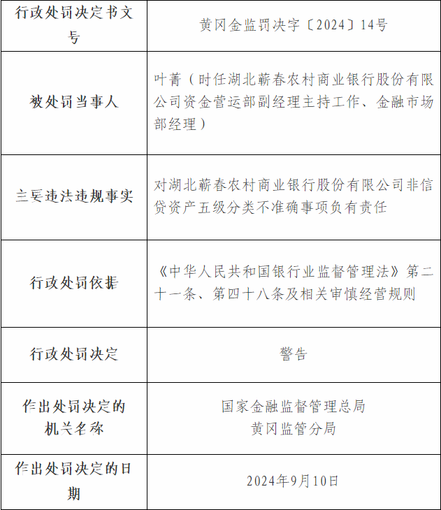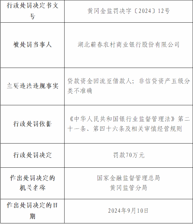 9月19日,国家金融监督管理总局黄冈监管分局公布的行政处罚信息显示,湖北蕲春农村商业银行股份有限公司因两项违规行为——贷款资金违规回流至借款人及非信贷资产五级分类不准确,被处以70万元罚款。同时,针对非信贷资产五级分类不准确的问题,该行的资金营运部前经理张谦及资金营运部(时任副经理主持工作)、金融市场部前经理叶菁均被监管当局给予警告处分。