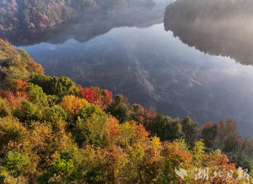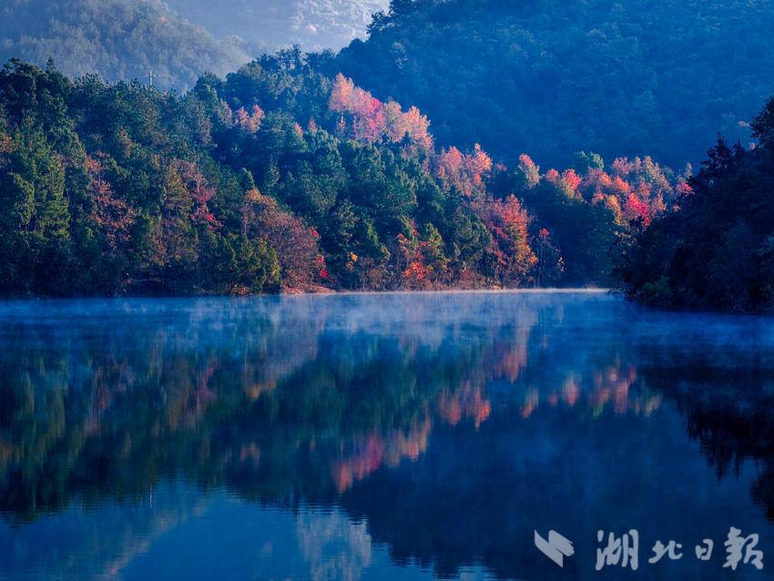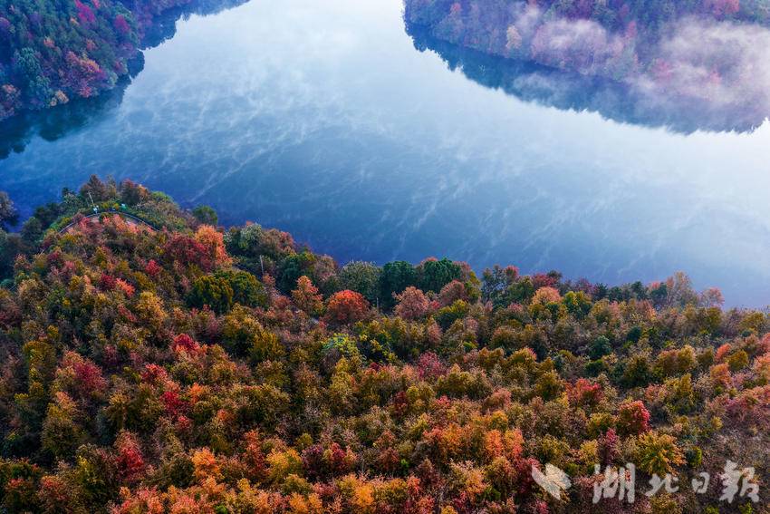 每到秋冬时节,晨光初露的时刻,九潭湖的美便有了灵动的韵律。澄澈的蓝天下,清冽湖水如镜面铺开,将岸边的红叶尽数收纳:热烈的火红、深沉的暗红与镶着金边的橙红层次分明,顺着山势铺展,漫过岸线,漫入水中,把碧波晕染成流动的丹霞。